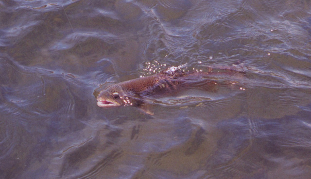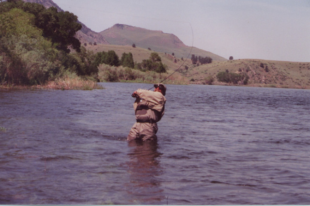 After exiting the canyon the river which for the most part is like a meandering wide spring creek begins a series of rapids near Hardy Creek. In high water the one under the freeway bridge is something to be reckoned with, It was just below this section where I had one of my most memorable experiences. Floating with Rad Davis and my brother in mid June we went whipping thru this fast water.At one point the water shallowed out somewhat and a prodigious caddis emergence was taking place. The air was filled with large tan caddis comming out of the rapids. Normally, this water is too fast to hold fish but they were in there. Rad instructed us to thow our caddis imitations towards the bank. I reluctantly complied figuring I was wasting my time and a thrilling boat ride. All of a sudden a large rainbow came from nowhere and ate it. I was so shocked I didn t set the hook! Another short cast resulted in another fish doing the same thing and this time I was ready and hooked him. My brother had the same experience on the other side of the boat. NO way Rad could stop the boat so we floated another 1/4 mile with two fish on untill we could get to some calmer water to land them. It was so cool to see fish smashing caddis in this fast water . After we landed the fish I walked back upstream and fished my way down catching fish after fish in that fast water. I ll never forget seeing the first two fish come out from nowhere, and attack my fly like mini sharks...... We floated down to Pelican point along some great flats that had fish rising to Caddis. To Rads delight we experienced many doubles, times when Jay and I both had fish on. It was a great way for Jay to end his trip. Below are some pix that Rad took during our floats: