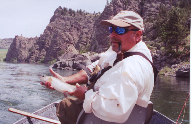 A stroke of luck came with the seasonal arrival of one Rad Davis, a native of the South who spends June thru Oct. guiding on the Mo. and tying flies for the Outfitter he guides for. I had met Rad , a pipe smoker , on line a couple years before and we traded some pipe repairs for flies over the years. When he heard I had moved to MT. he said he would get in touch when he arrived for the season. Rad was gracious enough to take me out in his driftboat and do most of the rowing. When he learned of my plans to get my boat going he showed mye how to row. A task that is much harder than it seems. There s a lot of skill in keeping the boat within casting distance of the bank and at the proper speed for a good drift. The rower must be on the lookout for rises so his partner can watch his fly in case a fish strikes. Rad and I got to quickly be good friends in our long hours together on the river. He s good easy company, always ready with a pertinent story from his long years on the river to fit almost any occaission.
