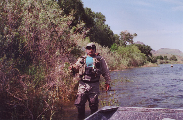 After exiting the canyon the river which for the most part is like a meandering wide spring creek begins a series of rapids near Hardy Creek. In high water the one under the freeway bridge is something to be reckoned with, It was just below this section where I had one of my most memorable experiences. Floating with Rad Davis and my brother in mid June we went whipping thru this fast water.At one point the water shallowed out somewhat and a prodigious caddis emergence was taking place. The air was filled with large tan caddis comming out of the rapids. Normally, this water is too fast to hold fish but they were in there. Rad instructed us to thow our caddis imitations towards the bank. I reluctantly complied figuring I was wasting my time and a thrilling boat ride. All of a sudden a large rainbow came from nowhere and ate it. I was so shocked I didn t set the hook! Another short cast resulted in another fish doing the same thing and this time I was ready and hooked him. My brother had the same experience on the other side of the boat. NO way Rad could stop the boat so we floated another 1/4 mile with two fish on untill we could get to some calmer water to land them. It was so cool to see fish smashing caddis in this fast water . After we landed the fish I walked back upstream and fished my way down catching fish after fish in that fast water. I ll never forget seeing the first two fish come out from nowhere, and attack my fly like mini sharks...... We floated down to Pelican point along some great flats that had fish rising to Caddis. To Rads delight we experienced many doubles, times when Jay and I both had fish on. It was a great way for Jay to end his trip. Below are some pix that Rad took during our floats: