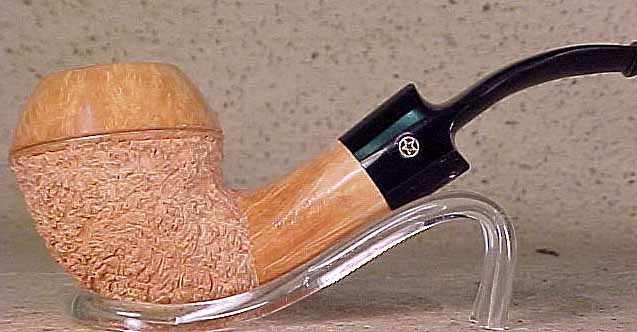Today s work consists of a special order that I didn t quite get right. I liked the shape I was working on and made slightly three pipes varying the stem and ferrule work. All three are available on the web catalog. The pipe is supposed to be a graceful curved shank rounded bull dog. Didn t get enough curve in the shank but nonetheless the design, supplied by the customer still came out well even tho not exactly what he was looking for. The first pipe is a two star straight grain Pristine finish: