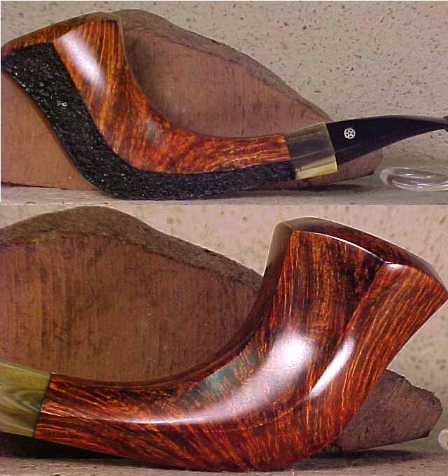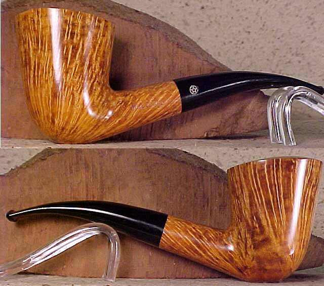 The next pipe is available on the web. I found a bandsawed block that looked pretty nice laying on my bench. Decided to see what would come of it. Turned out totally flawless with good grain. We had just gotten a Larsen in for repair with an understain, and a gold overstain on top. I decided to try to duplicate it. I didn t get the color exact but it s not bad.