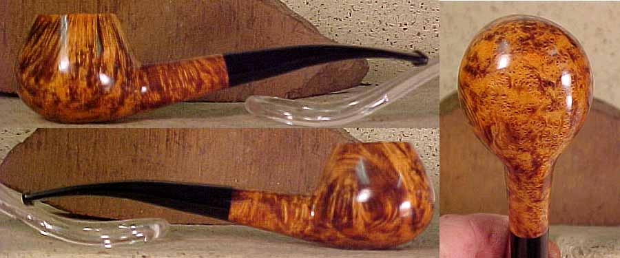 The next two pipes are for two very special fellows in the Pipe world. Tom Dunn, of the Pipe Smokers Ephemeris and Joel Farr of Pipe Friendly magazine. I received a few pipes back from a store for trade. Apparently, they sat in a drawer for years and were only recently re-discovered. The store owner decided to get new stock. I happened to be reading the Ephemeris when they came in and I noticied a similarity between one of the pipes and the one in Tom s logo. I decided to send him the pipe. (Which I finally got around to doing today with my yearly contribution) The pipe is dated 1984 and was made by me It has nice grain and is a natural finish, which doesn t show up well. Here it is:
